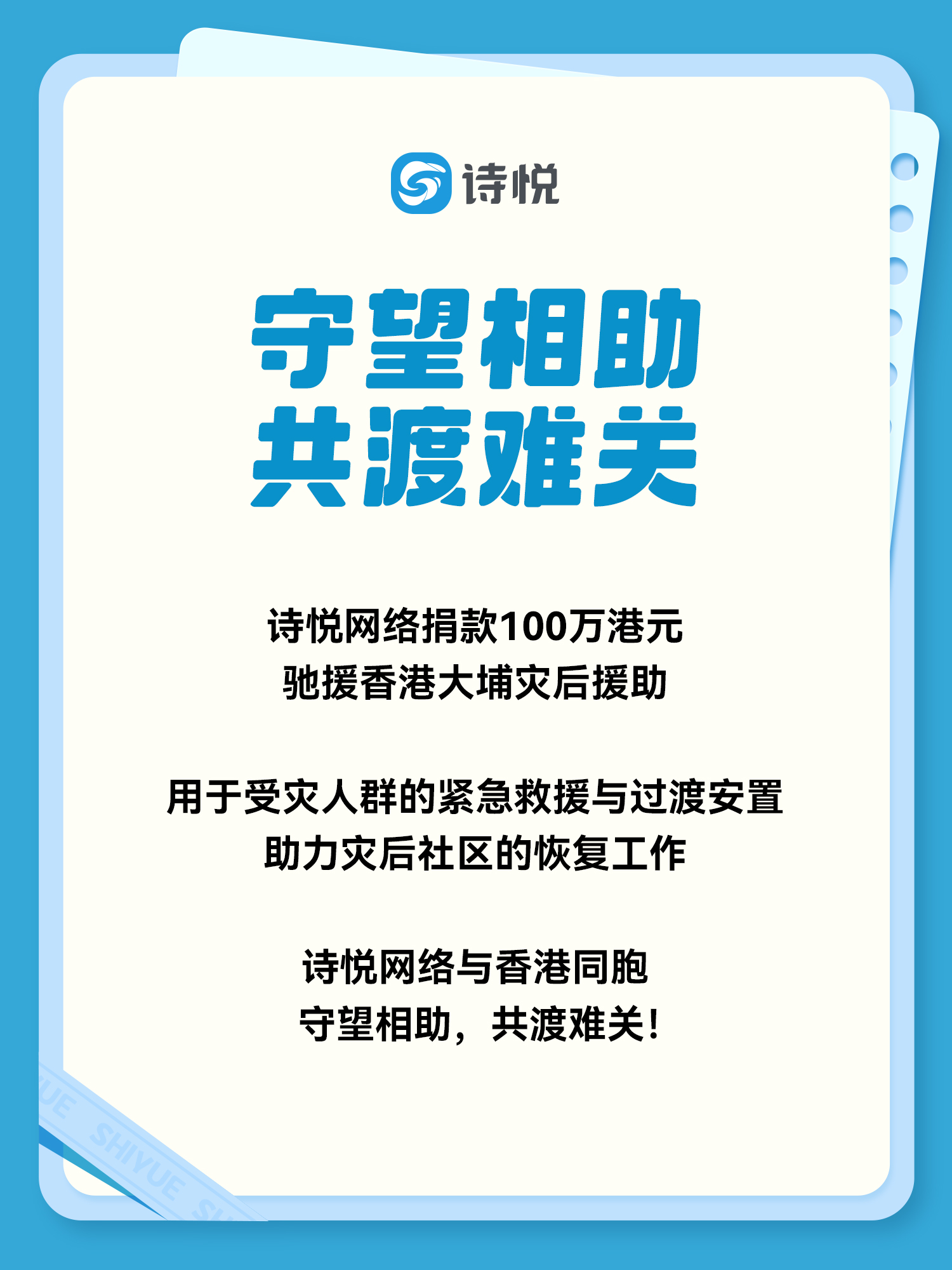 诗悦网络捐赠100万港元,捐款将用于受灾人群的紧急救援与过渡安置,并助力灾后社区的恢复工作。我们将持续关注赈灾救援情况,愿与社会各界携手,帮助受灾同胞早日渡过难关、恢复正常生活。